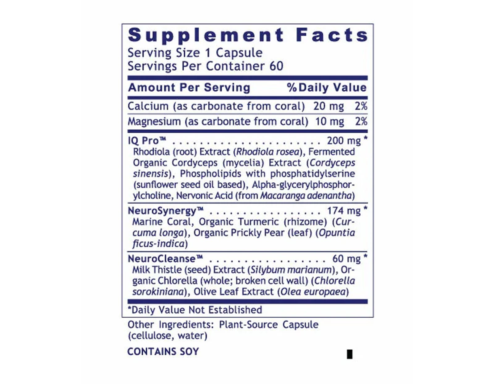 The first blend, IQ Pro features Rhodiola root extract, fermented cordyceps extract, and phospholipids. Our second blend, NeuroSynergy offers marine coral, organic turmeric, and organic prickly pear leaf. The last blend, NeuroCleanse, rounds out this formula, containing milk thistle seed extract, organic chlorella, and olive leaf extract. This formula perfectly supports brain health, including advanced lipid membrane support.