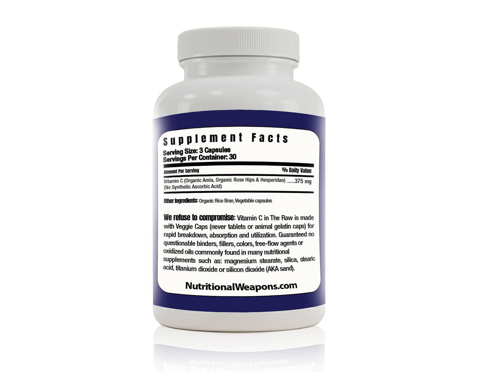 We refuse to compromise: Vitamin C in The Raw is made with Veggie Caps (never tablets or animal gelatin caps) for rapid breakdown, absorption and utilization. Guaranteed no questionable binders, fillers, colors, free-flow agents or oxidized oils commonly found in many nutritional supplements such as: magnesium stearate, silica, stearic acid, titanium dioxide or silicon dioxide (AKA sand).